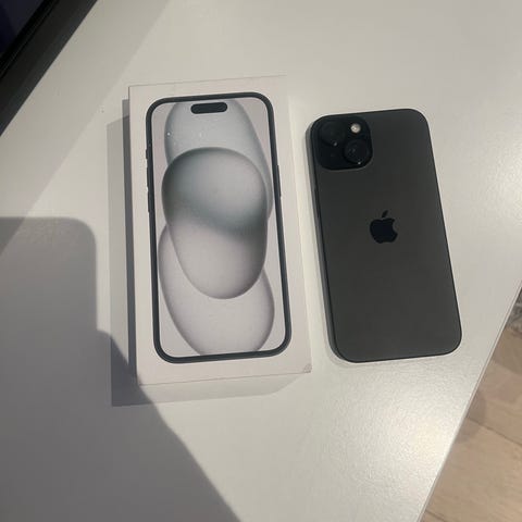 Apple iPhone 15 Pro Max smartphone med 256 GB internminne. Modellen på bilden är i svart färg. Enheten har trippelkamera på baksidan och levereras i originalkartong enligt bilden. Lämplig för användning med iOS-appar, surf, foto, video och vardaglig kommunikation.batteri är 85%.