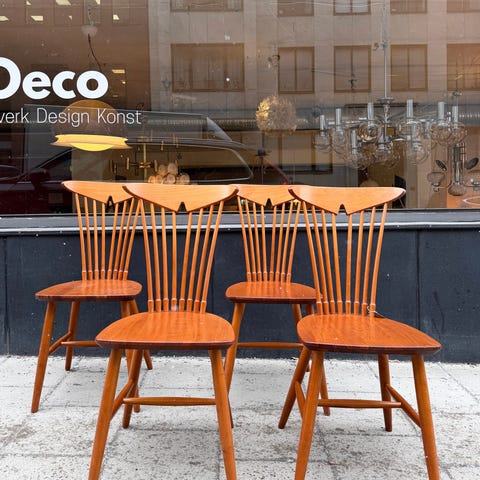 Snygga pinnstolar målade i en fin ljusgrå färg. Har lite skav i färgen och skulle må bra av att limmas på sina ställen, men är stabila nog. Vi har använt stolarna i befintligt skick.