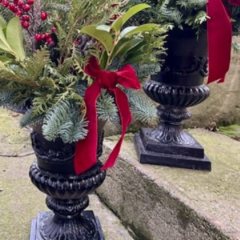 Klassisk urnaformad kruka på fot i svart färg. Krukan har dekorativ kant upptill och står på fyrkantig bas. Passar för plantering av blommor eller växter, exempelvis vid entré, uteplats eller hem. Är i plast. Ca 80 cm