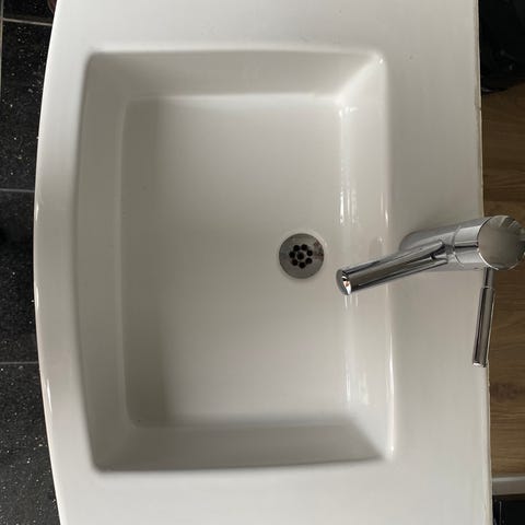 FM Mattsson tvättställsblandare med tvättställ och underskåp i träutförande, 60 cm brett och 40 cm djupt. Tvättstället är vitt med rundad front och integrerad ho. Underskåpet har två dörrar med metallhandtag och erbjuder förvaringsutrymme för badrumsartiklar. Blandaren är i kromat utförande. Fint skick.