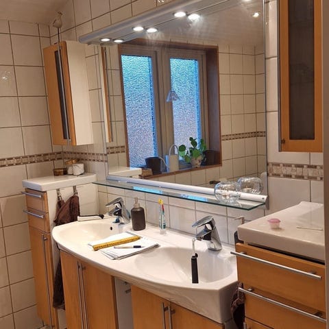Tvättställ och underskåp trä. FM Mattsson blandare. Kommod