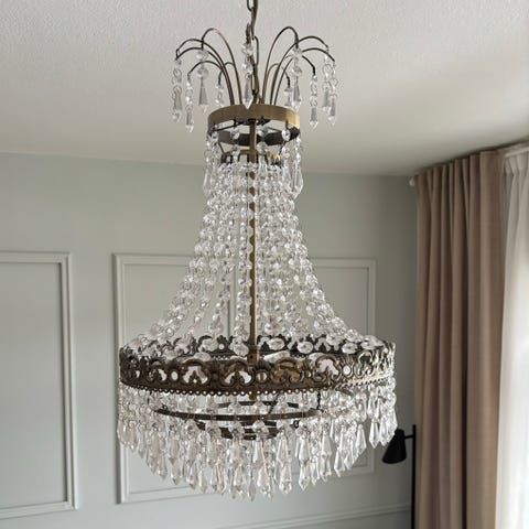 Fint kristallkrona från 1980 talet o mässing, komplett prismor, 4 lampor och 5 levande ljus källor. Bra skick sparsamt använt.