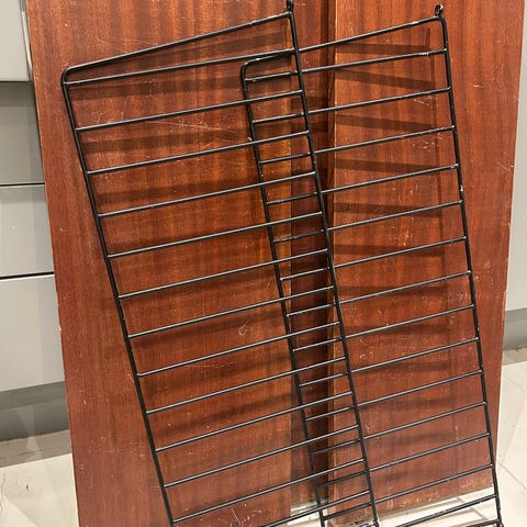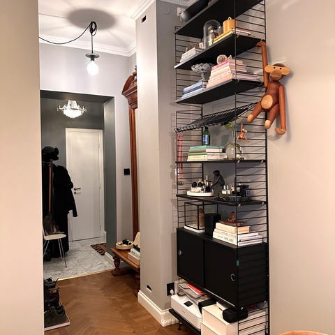 String hyllsystem med skåp i vit färg, formgivet av Nils Strinning. Systemet består av sidogavlar, tre öppna hyllplan och ett underskåp med skjutdörrar. Passar för förvaring av böcker, dekoration eller vardagsföremål i exempelvis vardagsrum, arbetsrum eller hall. Klassisk väggmonterad förvaringslösning med öppen hylla ovan och dold förvaring nedtill.