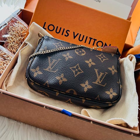 En brun Louis Vuitton-väska med det ikoniska monogrammönstret och en