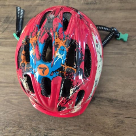 Abus cykelhjälm i blå färg. Hjälmen har flera ventilationshål och justerbart spänne under hakan. Invändigt finns vaddering och remmar. Avsedd för cykling och liknande aktiviteter där huvudskydd behövs. Hjälmen har en baklampa. Storlek 50-55. Passar barn emellan 0-2,5 år.