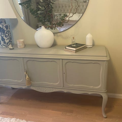 Skänken är i fint skick utöver ett litet märke framtill (se bild) och en liten spricka ovanför höger bakben (se bild). Den är använd som tv bänk och har ett hål i baksidan för sladd.