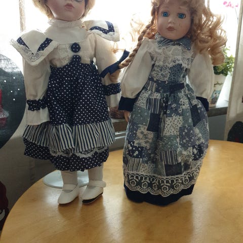 Säljer en prydnads docka med porslins huvud och händer, 48 cm hög. Finns i Borlänge och hämtas här skickas ej.