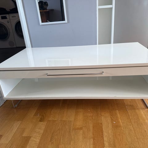 Soffbord/TV-Bänk i snygg vit design med ben i borstat stål. Finns ett litet märke på ovansidan i ena hörnet. Se foto.
