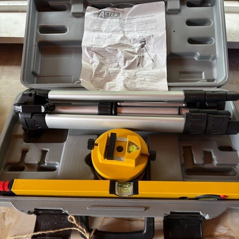DeWalt laserverktyg med tillhörande förvaringsväska. Produkten inkluderar laser-enhet och fäste, samt hårt plastfodral för transport och förvaring. Lämplig för mät- och uppriktningsarbeten vid bygg- och renoveringsprojekt där noggrann linje- eller punktmarkering behövs.