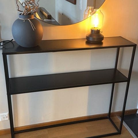 Snygg hylla/sideboard från IKEAs serie VITTSJÖ med 3 hyllplan. Mittenhyllan är i härdat glas och topp- och bottenpanelerna i trä med en svartbrun färg. Svart metallram. Hyllan har justerbara fötter. Mer info finns på Ikea.se