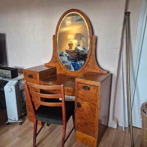 Ett mycket fint antikt sminkbord i teak med tillhörande stol. Hel och fin med glasskiva på toppen och svängbara speglar.