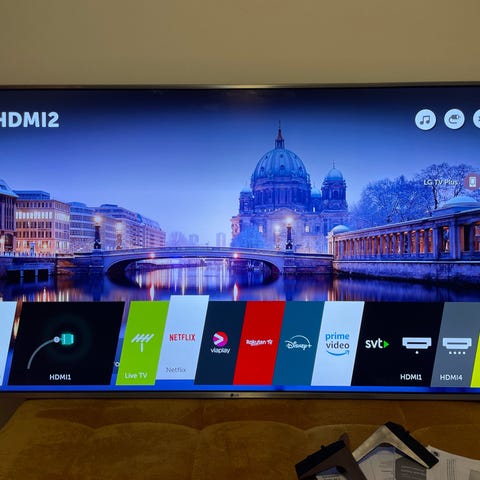 Samsung böjd TV. Modellen har välvd skärm och är avsedd för hemmabruk, exempelvis för tv-tittande, film och spel. Stativet är mittmonterat och tv:n placeras på bänk eller annan plan yta.