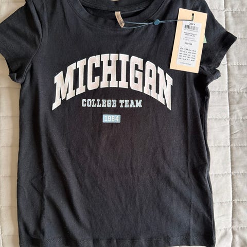 En t-shirt är ny med etikett, den andra är utan etikett men oanvänd, resten är begagnade kläder men i gott skick.