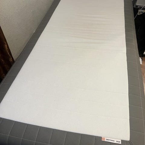 Sängen Sultan Stamnes, 4 ben, bädmadrassen Tjöme (avtagbart överdrag som tvättas i 40C) kan säljas utan gavel och överkast med kudde.