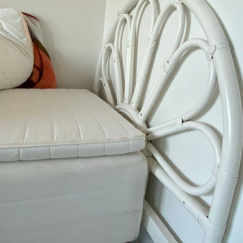 Säng 90x200, bädmadrass, sämggavel och sängbord i rotting, sängöverkast med matcjande kudde