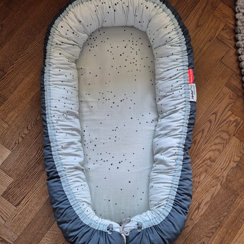Kaxholmen babynest i grå färg med vitt stjärnmönster. Mjuk, vadderad kant runtom som ger en ombonad liggyta för spädbarn. Justerbar öppning nertill med spänne och dragkedja. Passar exempelvis i spjälsäng, vagn eller på soffa och säng som extra liggyta för bebis under uppsikt. Avtagbar tyg som enkelt tvättas i maskin, har tvättats parfymfritt och utan sköljmedel. Nypris ca 500:-