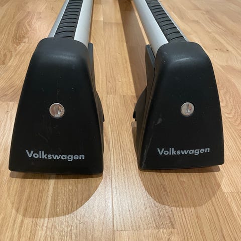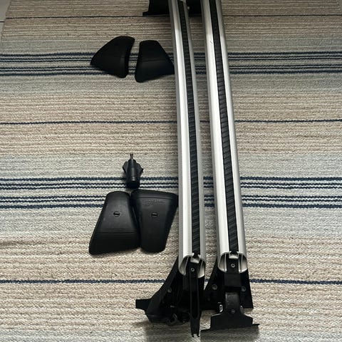 takräcken i aluminium med svarta plast- och gummidetaljer. Paketet inkluderar två lasthållare samt tillhörande fästen och smådelar enligt bilder. Takräckena är avsedda för montering på bilens tak och kan användas som bas för till exempel takbox eller annan last
