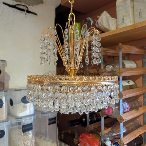 Stor pampig kristallkrona, glimmar super fint i solljuset! 6 ljuspunkter