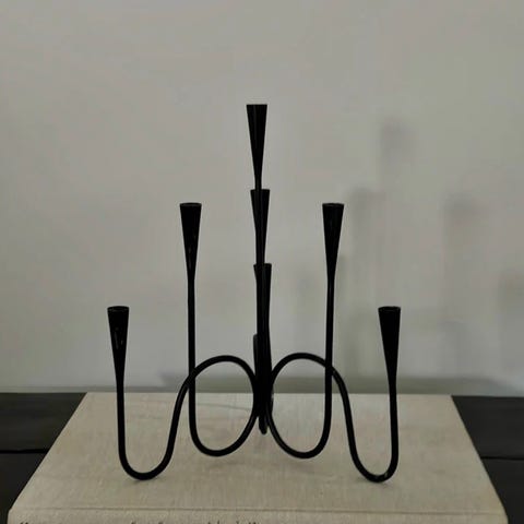 En ståtlig kraftig svart ljusstake med 3 armar och 4 fötter. Vackert hantverk.
