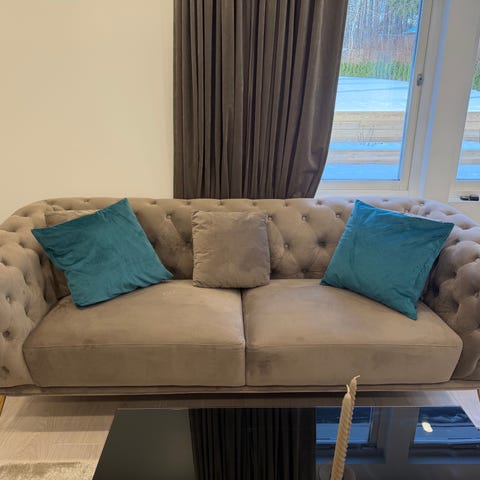 Mio soffa i rosa sammetstyg med knappar i ryggstödets stoppning. Soffan har en rundad form och är lämplig för vardagsrum eller liknande utrymmen.