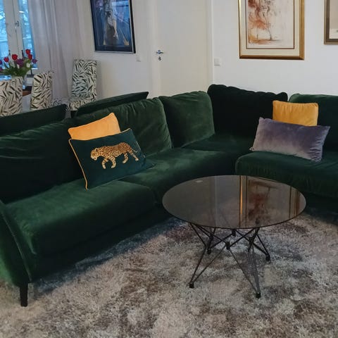Soffan är en 3-sits bäddsoffa med utdragbar sängdel och förvaring under schäslongen. Klädseln är i mörkgrönt tyg (Djuparp mörkgrön enligt produktbild).