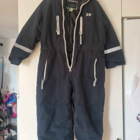 En overall, storlek98, som tåler regn. Välanvänd men som går att använda. Finns ett litet hål som man kan laga.