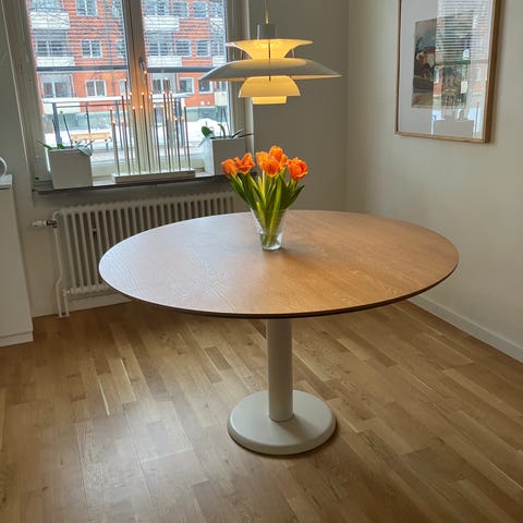 Välvårdat runt matbord 115 cm i en tidlös och enkel design, Bordet är i massiv ek och passar för fyra sittplatser.
