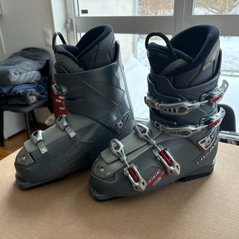 Atomic Live Fit 80 pjäxor i svart färg. Storlek 27.0 (mondopoint), märkning 27.0/315 mm på sulan. Modellen har två justerbara spännen och bred powerstrap upptill för bättre stöd runt vrist och underben. Live Fit-zoner på sidorna ger anpassningsbar passform över fotens bredaste del. Yttersula med utbytbara tå- och hälplattor anpassade för alpina bindningar. Invändig stoppning och plös ger dämpning och komfort för alpin skidåkning på pist.