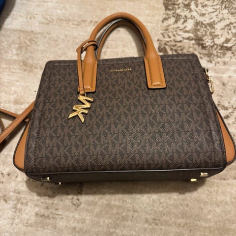 Michael Kors handväska för kvinna i läder. Väskan har ett brunmönstrat yttertyg med MK-logga och svarta läderdetaljer, inklusive handtag och sidopartier. Modellen är en strukturerad handväska med dubbla handtag och dragkedja upptill. På framsidan finns metallogo och dekorativ hängande detalj med lås. Väskan levereras med skyddspåse enligt bild. Passar som vardags- eller arbetsväska med plats för mindre personliga tillhörigheter. Säljer nu båda för 2500kr