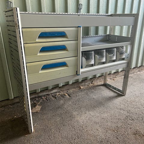 Verktygsinredning i form av ett hyllsystem i metall, grön färg. Inredningen består av öppna hyllplan samt lådor på ena sidan för förvaring av verktyg och smådelar. Konstruktionen är fristående och lämpar sig för montering i exempelvis garage, verkstad eller förråd. Översta planet har upphöjda kanter som hjälper till att hålla innehållet på plats. Metallutförandet ger en robust lösning för organiserad förvaring.