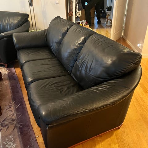 Välbevarad fin mörkblå skinnsoffa. Kommer ifrån ett rök/djurfritt hem.