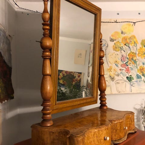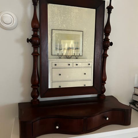 Smyckeskrin i rött trä med uppfällbart lock och inbyggd spegel. Utrustat med flera utdragbara lådor med metallhandtag för förvaring av smycken och småsaker. Passar för förvaring på byrå, hylla eller garderob. Ytan har vissa synliga märken och repor enligt bild.