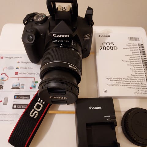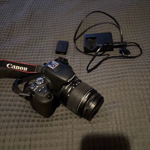 Canon EOS digital systemkamera med objektiv. Kameran är en digital SLR-modell med utbytbar optik. På bilderna syns kamerahus med zoomobjektiv, kamerarem, laddare, kablar, objektivlock, kamerahuslock, manualer samt en kameraväska från Canon. Utrustningen lämpar sig för allmän fotografering, till exempel vardagsbilder, resor och enklare fotojobb där man vill ha kontroll över inställningar som bländare, slutartid och ISO.