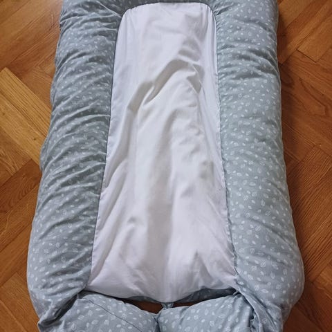 Done by Deer babynest som tillbehör till barnsängar. Ytterkant i grått tyg och insida med vitt tyg och svarta prickar. Mjuk, vadderad kant runt om och justerbar öppning med dragsko nedtill. Babynestet kan användas i spjälsäng, på soffa eller annan plan yta för att ge en ombonad sov- och viloplats för spädbarn. Yttertyg och fyllning i textilmaterial.