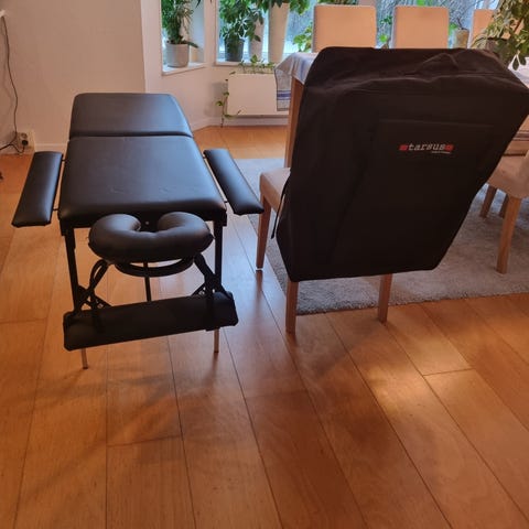Mycket bra massagebänk som tillkommer med väska. Inga defekter eller skador. Den är också ihopfällbar och praktisk samt tar inte mycket plats. Mått: 195-70-66 cm