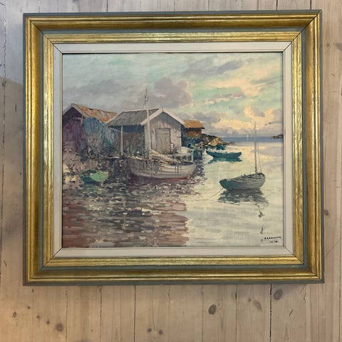 Signerad tavla i form av en oljemålning med skärgårdsmotiv. Oidentifierad konstnär. Motivet föreställer båthus och mindre båtar vid vattnet, med reflektioner i vattenytan. Målningen är inramad i en klassisk träram. Passar som väggdekoration i exempelvis vardagsrum, hall eller sommarstuga. Köpt på auctionet i höstas.