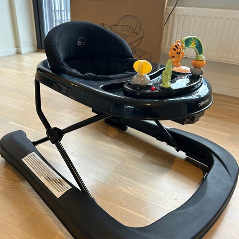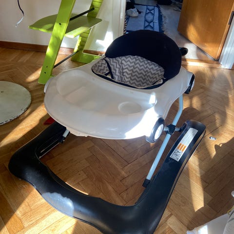Gåstol för baby i plast med vadderat tygsäte. Sätet har mönster med stjärnor och ger stöd runt hela kroppen. Gåstolen har en vit överdel och blå bottenram med hjul. På framsidan finns en lekpanel med flera fasta leksaker i plast som barnet kan nå när det sitter i stolen. Höjden kan justeras genom metallramen undertill. Avsedd för små barn som kan sitta själva och användas inomhus på plana ytor.