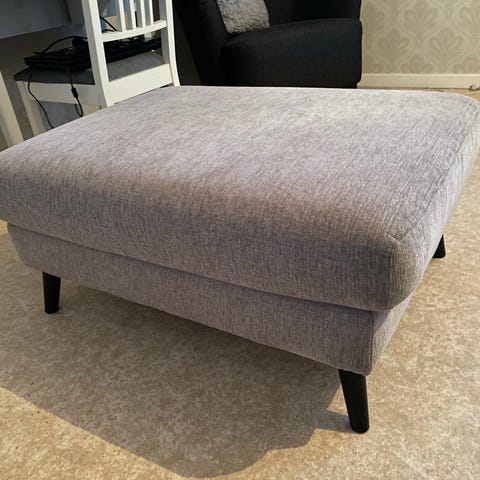 Nätt och fin fotpall i beige Manchestertyg från IKEA.