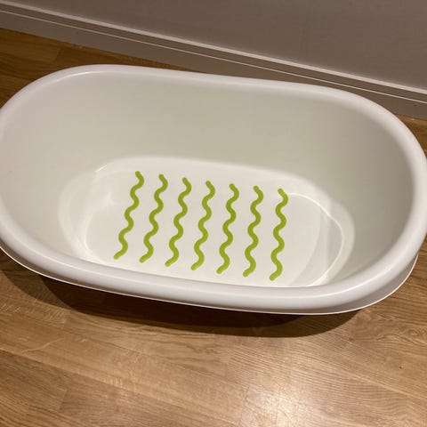 Badbalja i vitt plastmaterial med integrerat halkskydd i botten i form av gröna mönster. Badkaret är utformat för små barn och har rundade kanter för bekvämare badstund. Måtten enligt skiss är cirka 79 cm i längd, 50 cm i bredd och 24 cm i höjd, med en bottenbredd på cirka 30 cm. Passar för användning i badrum eller duschutrymme där det finns plats för ett fristående babybadkar.
