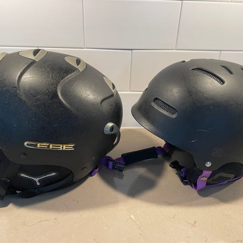 Ett blandat parti med hjälmar. Inkluderar skid-, cykel- och snowboardhjälmar i olika storlekar. Begagnat skick.