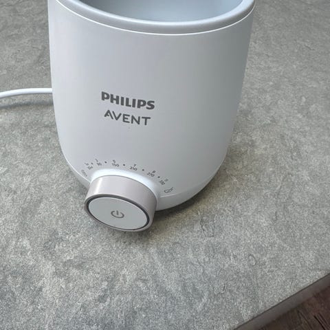 Philips Avent flaskvärmare i vit färg. Enheten är avsedd för uppvärmning av nappflaskor och barnmatsburkar. Den har vred med flera inställningar för temperatur och uppvärmningsläge samt strömbrytare på framsidan. Flaskvärmaren ansluts med sladd till vägguttag och är avsedd för användning i hemmet vid matning av spädbarn och småbarn.