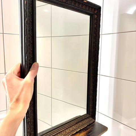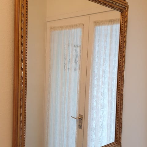 Oval spegel med guldfärgad ram. Spegeln har dekorerad kant och en äldre, lätt patinerad spegelyta. Passar exempelvis i hall, sovrum eller vardagsrum som väggspegel eller dekoration.
