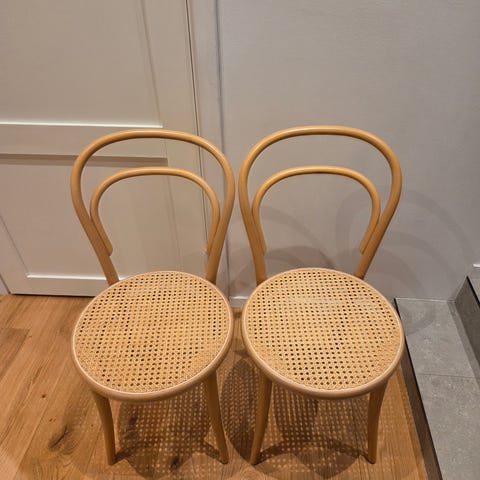 4 st Öglan stolar, varav 1 i originalskick och 3 har fått en träsits ovanpå rottingen som gått sönder.