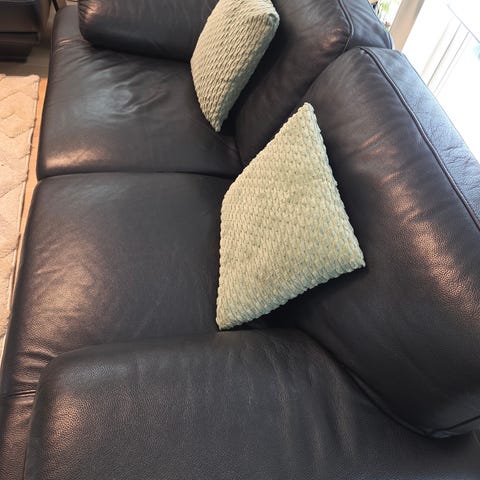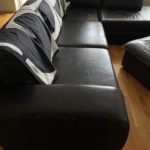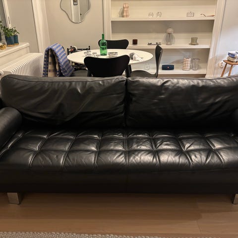Svart skinnsoffa i fint skick. Mycket fin kvalité och välvårdad. Designer och tillverkare okänd. Har en svag doft av sköljmedel/parfym.
