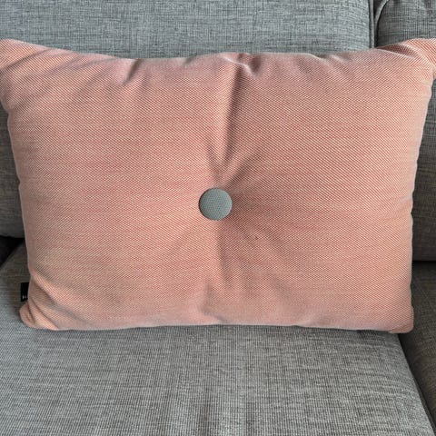 Hay kudde i rektangulär form med mittknapp. Fodral i beige tyg med slät yta. Passar som prydnadskudde i soffa, fåtölj eller säng i vardagsrum eller sovrum.
