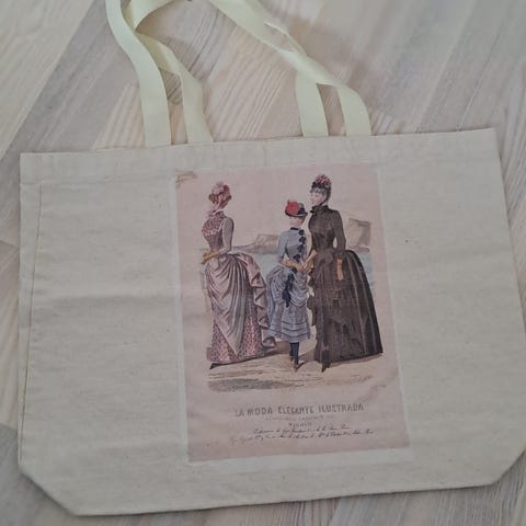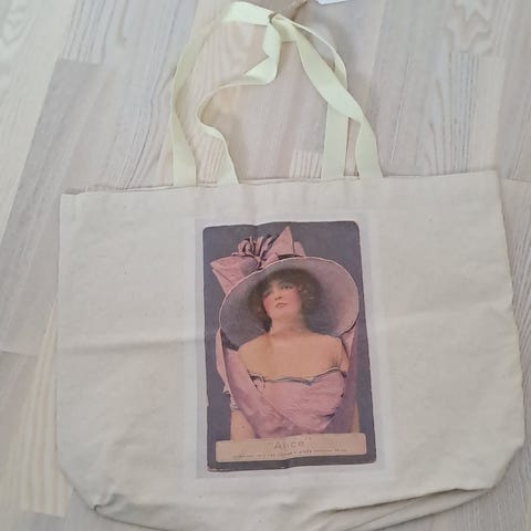 En tygväska från Primark. Tryck på ena sidan, Vincent Van Gogh motiv. Ljus blågrå färg. Ca 54 cm bred, 40 cm hög handtag ej medräknade), 8 cm djup. Oanvänd.