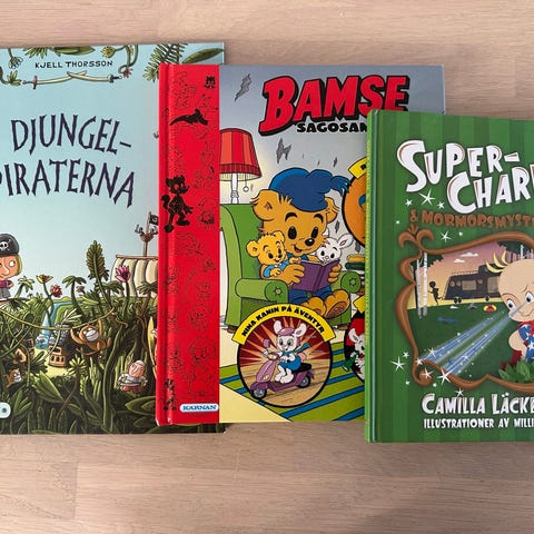 Camilla Läckberg Super-Charlie barnböcker i serie om Super-Charlie. Bilderböcker med illustrationer av Millis Sarri. Böckerna har hårda pärmar och färgillustrationer.