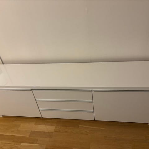 TV-bänk ”BESTÅ” från IKEA med högglans vita dörrar, två hyllplan samt en toppskiva i vitt glas. 120x40x38. Blir ca 10 cm högre med benen som medföljer. Kommer även med ett inbyggt fäste, roterbart, för en TV på 37-55 tum.