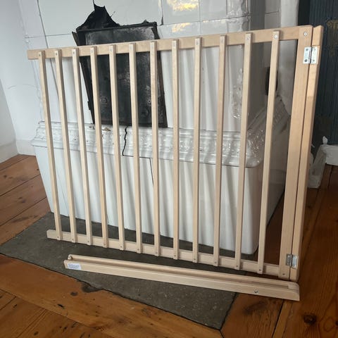 Relaxdays barngrind/hundgrind i trä, 70 cm hög, vit. 154 cm maxbredd. Grind med flera paneler som kan vinklas med hjälp av gångjärn för flexibel placering. Kan användas som säkerhetsgrind vid dörröppningar, trappor eller runt exempelvis kamin. Hopfällbar konstruktion som kan ställas undan vid behov. Utrustad med golvskydd för att minska risk för repor på golvytor.