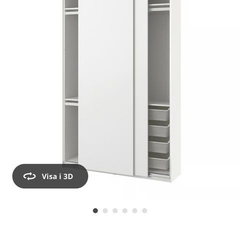 Vit garderob med spegeldörr, klädstång och hyllor.